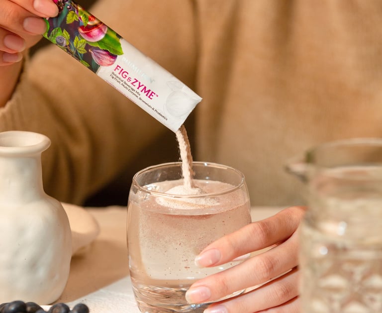 Fig&Zyme supplement contains a blend of 5 different types of enzymes, including Amylase, Cellulase, Lactase, Lipase, and Protease. It also contains Probiotics, Soluble and Apple Fibre, Mixed Fruit Powder (Blackberry, Raspberry, Blueberry, Elderberry), Konjac Powder, Aloe Vera, Inulin, Pineapple Enzyme, Multi-Vitamins, and Vitamin C.